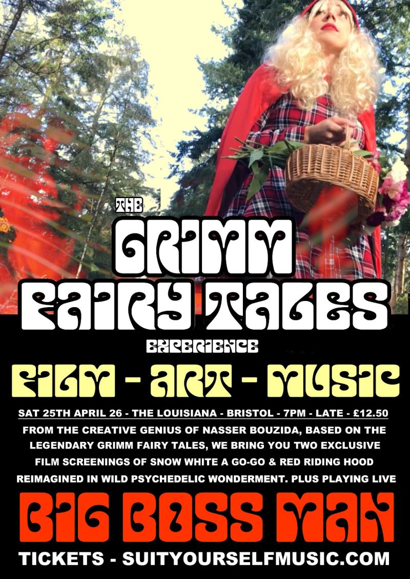 From the genius mind of Nasser Bouzida (BIG BOSS MAN) comes a series of short films celebrating the legendary stories of the GRIMM FAIRY TALES originally written by Jacob and Wilhelm Grimm in 1812. these short films have been imaginatively re-created to capture a more 60's psychedelic feel. Filmed in true bongo-vision Nass takes us on a journey through the first 2 humorous twisted tales capturing the vibe perfectly. With original soundtracks from BIG BOSS MAN and camera work and visuals by Nass SNOW WHITE A-GO GO & RED RIDING HOOD are must see's for lovers of the tales and the early to late 60's musical genre.