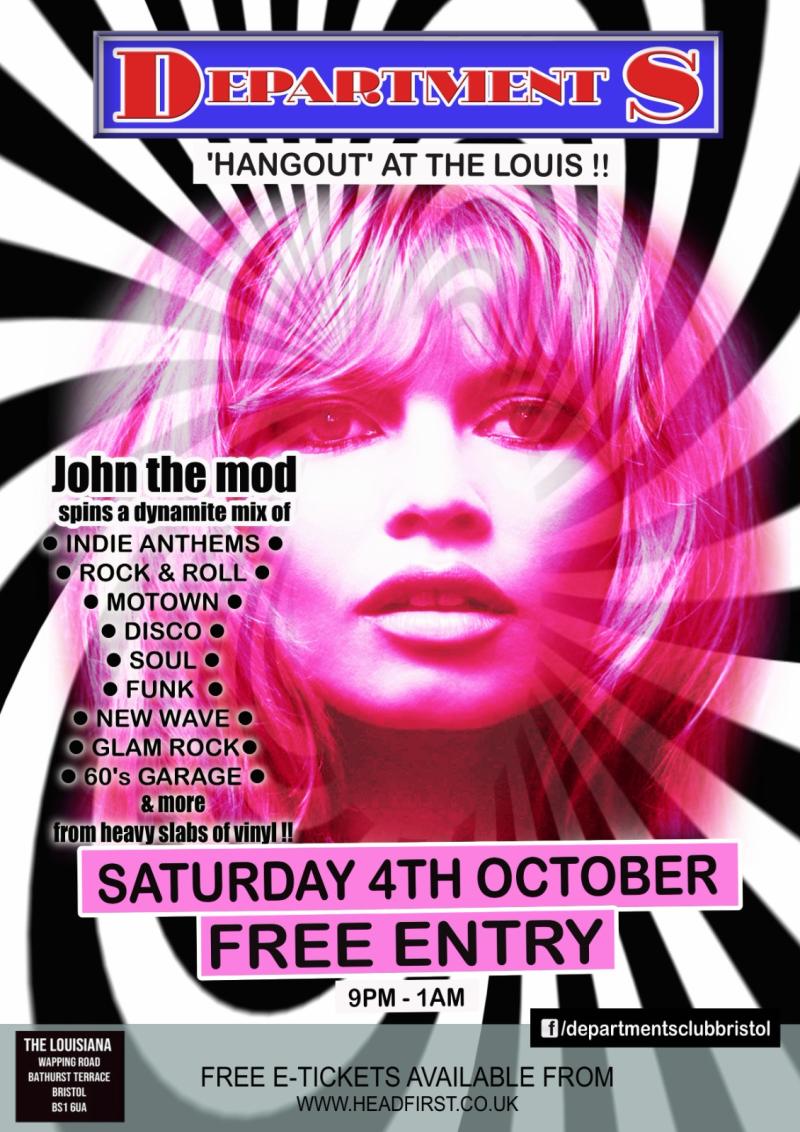 Department S are back at The Louisiana Saturday 4th October for a night of Indie Anthems, Brit Pop, 60's Garage, New Wave, Post Punk, Glam Rock, 60's Beat, Northern Soul, Alt 80's, Rock & Roll, Motown and anything decent!!