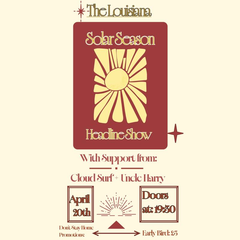 Ready to let loose and experience a night of outstanding upcoming Bristol talent? Then this is the night for you. With two incredible supports, Cloud Surf bringing feel-good melodic vocals mixed with funky, rhythmic ’70s-infused guitars, and Uncle Harry putting a modern twist on prog midwestern emo rock, infusing funk-influenced guitars with strong vocal lines. The night ends with Solar Season, putting a new sound to melodic soft rock through their anthem-driving choruses and electrifying stage presence. With this being the band’s first headline show, it’s bound to be a night to remember.