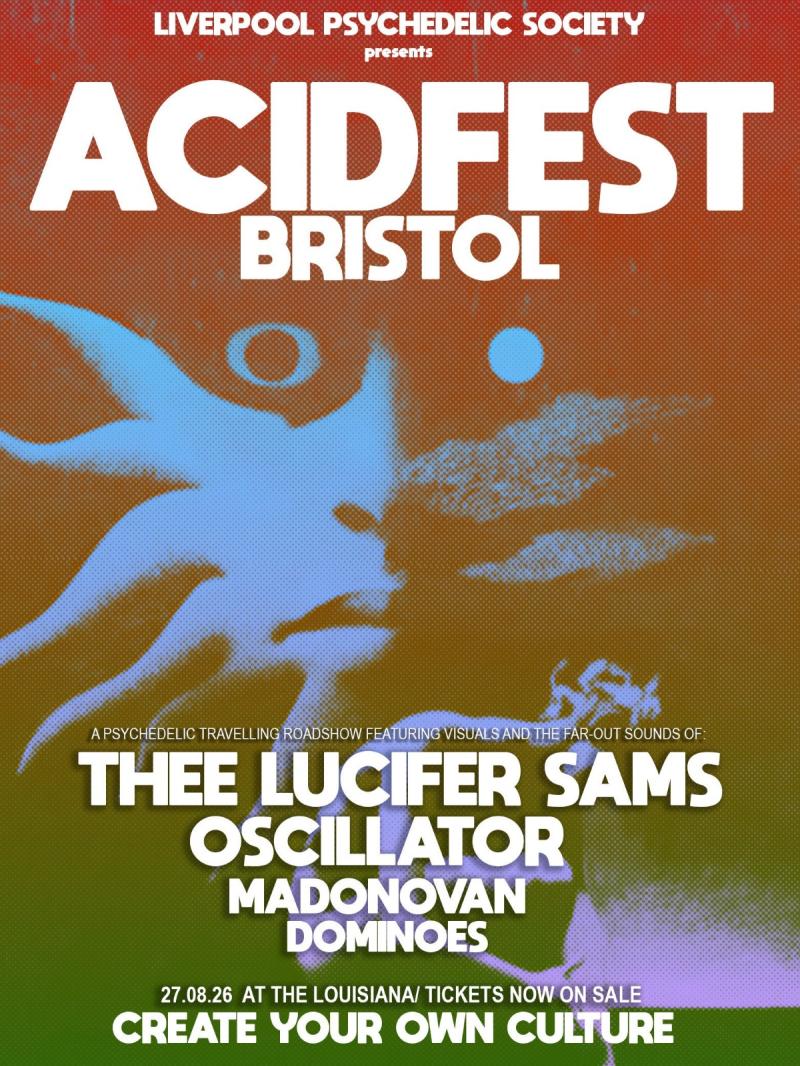 ACIDFEST BRISTOL marks the third time we hit Bristol, and if you've been to one of our events before you know you can't miss this one featuring psychedelic visionaries Thee Lucifer Sams' sonic rollercoaster; Oscillator, an amazing psych trio offering exciting, chaotic psych; Madonovan, the best shoegaze artist you've never heard of before, and Dominoes, a brilliant, solo artist who's equal parts Ivor Cutler and Syd Barrett. Rich in melody, ideas and whimsy, you are sure to enjoy his set.